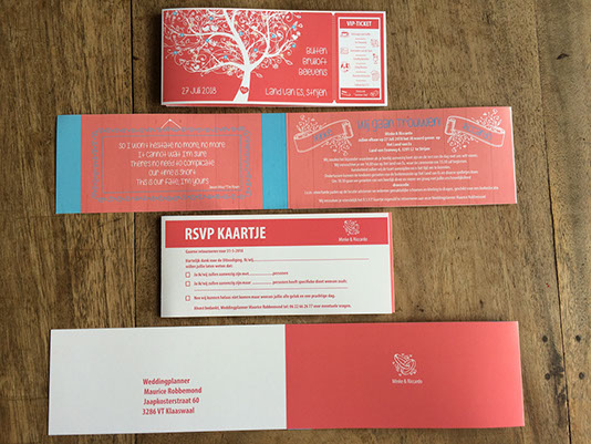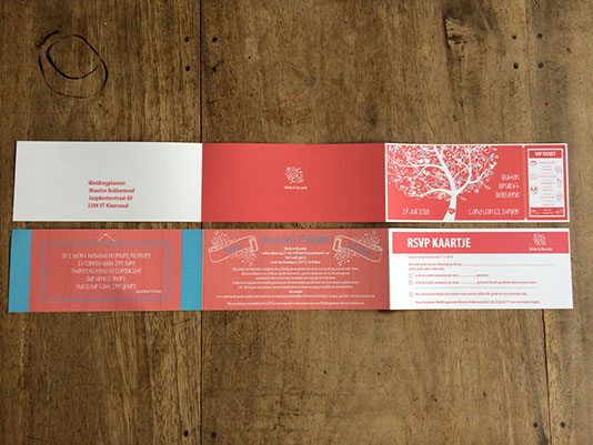 Ontwerp Trouwkaart formaat festivalticket met afscheurbaar RSVPkaartje
